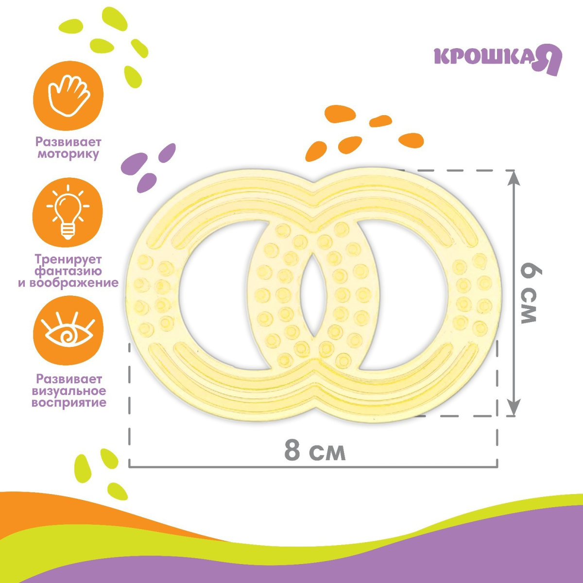 Прорезыватель снимает неприятные ощущения у малыша в период появления первых зубов. Также изделие подготовит ребёнка к процессу жевания, поспособствует формированию правильного прикуса и развитию мелкой моторики рук.