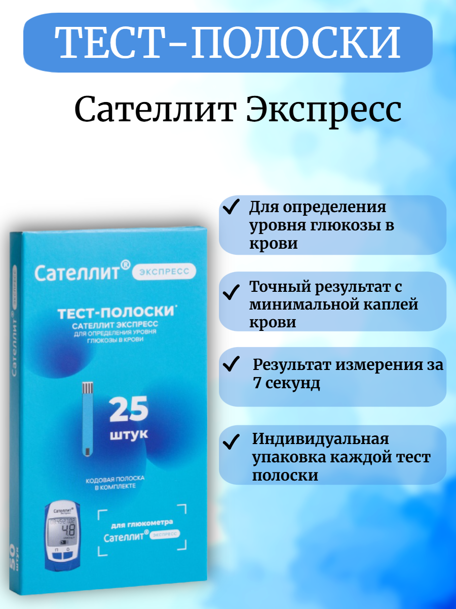 Тест-полоски Сателлит Экспресс №25 подходят для использования в глюкометре Сателлит Экспресс. Капиллярная электрохимическая полоска для маленькой капли крови. Диапазон показаний от 0,6 до 35,0 ммоль/л.