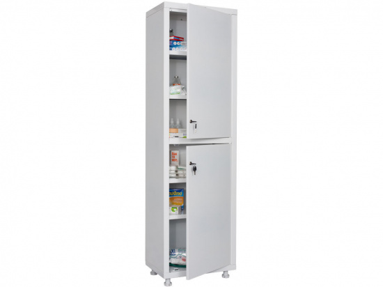 Шкаф для медицинских учреждений. Предназначен для хранения лекарственных средств, инструментов и медицинской документации. На металлические двери устанавливаются замки ПРАКТИК. Корпус шкафа выполнен из металла толщиной 0,6мм, дверь - 0,7мм. В комплект входят 4 опоры, с помощью которых можно регулировать высоту шкафа. Максимальная нагрузка на полку - 30кг.