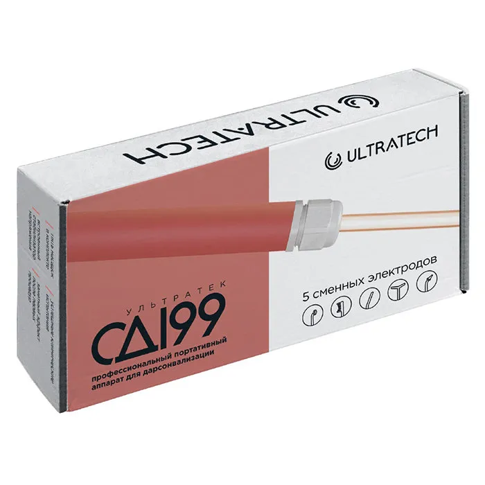 Аппарат для дарсонвализации Ультратек СД-199 предназначен для воздействия на определенную область тела импульсным быстрозатухающим током малой силы, высокого напряжения и частоты через специальные газонаполненные электроды различной формы. Дарсонваль для роста волос Ultratech безопасен в работе и может использоваться в домашних условиях без специальной подготовки.При использовании аппарата между электродом и поверхностью кожи образуется электрический разряд малой силы, который оказывает разнообразное влияние на организм в зависимости от установленных дозиметрических параметров интенсивности.Во время проведения дарсонвализации выделяется озон и окислы азота, которые оказывают дополнительное воздействие в механизме данного метода. Тепловой эффект на обрабатываемых участках кожи практически отсутствует. Ощущение незначительного тепла наблюдается лишь при внутриполостных процедурах.Дарсонваль для укрепления волос оказывает избирательное влияние на вегетососудистую нервную систему. Происходит усиление местного кровообращения, расширение капилляров кожи и подкожных тканей, улучшение микроциркуляции, стимуляция клеточного обмена и восстановление процессов в тканях.Ушной электродподходит для обработки ушных раковин, назального воздействия, а также локального воздействия на точечные очаги воспаления.Шейно-спинной электрод(рогатка) захватывает сразу большую площадь и позволяет проводить процедуры на больших поверхностях, например, в области спины и шеи.НАЗНАЧЕНИЕЛечение проблемной кожи, угревой сыпи, прыщей, комедонов.Профилактика появления рубцов постакне, борьба с инфильтратами.Коррекция любых стадий целлюлита, даже фиброзного целлюлита.Борьба с болевыми синдромами различной этимологии.Противодействие алопеции, стимуляция роста волос.Снижение жирности кожи лица и головы.Борьба с себореей любой стадии, перхотью.Остеохондроз и проблемы с суставамиВарикозное расширение вен