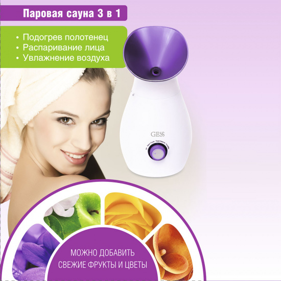 ФРУКТОВАЯ ПАРОВАЯ САУНА 3 в 1, арт.GESS-701 включает 3 функции: паровая сауна, подогрев полотенец и увлажнитель воздуха для всех типов кожи.