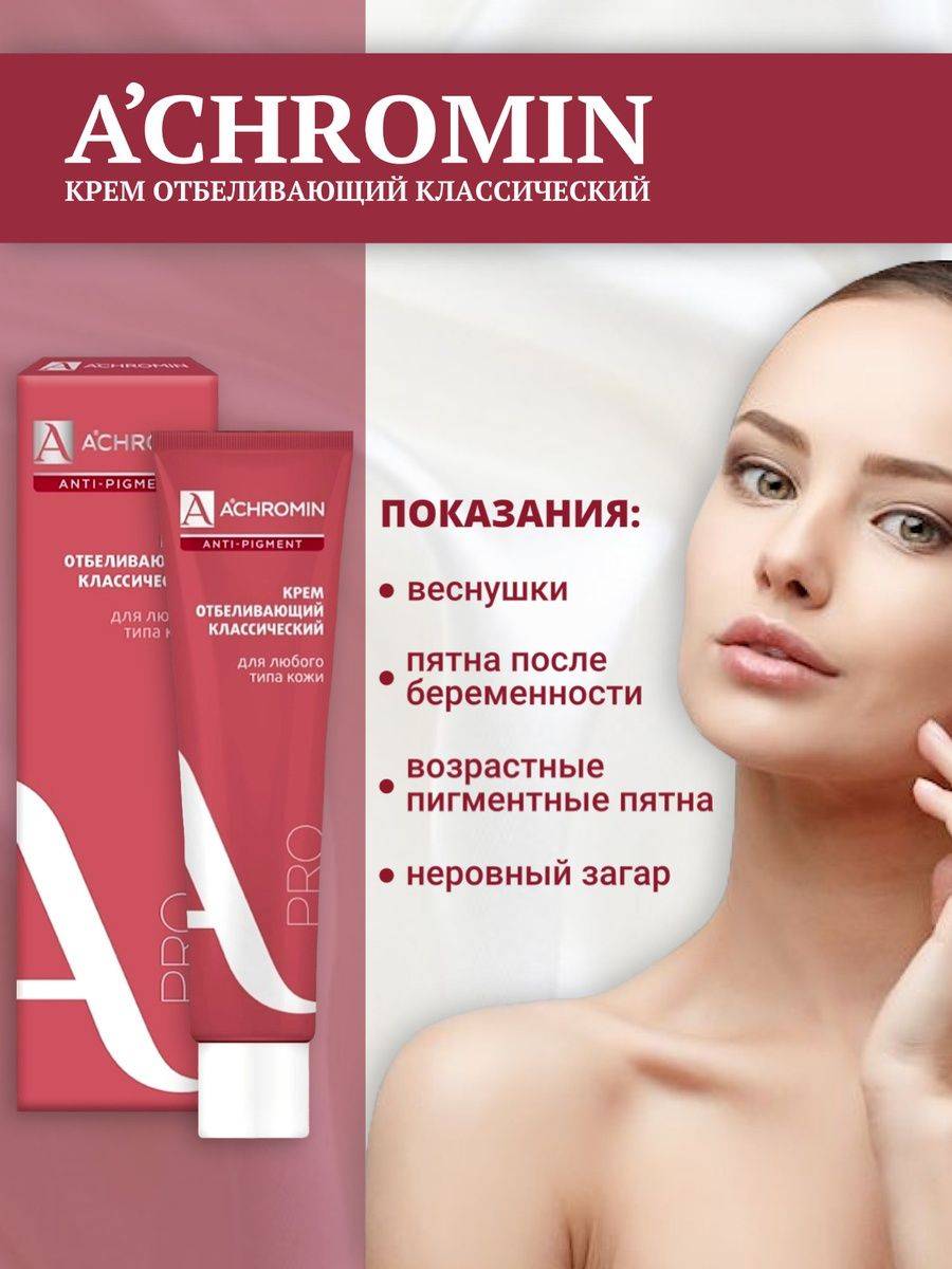 Крем Ахромин - предназначен для уменьшения выраженности гиперпигментации на коже, а так же в качестве средства защиты от действия ультрафиолетовых лучей. Обладает нежной текстурой и ароматом розы.