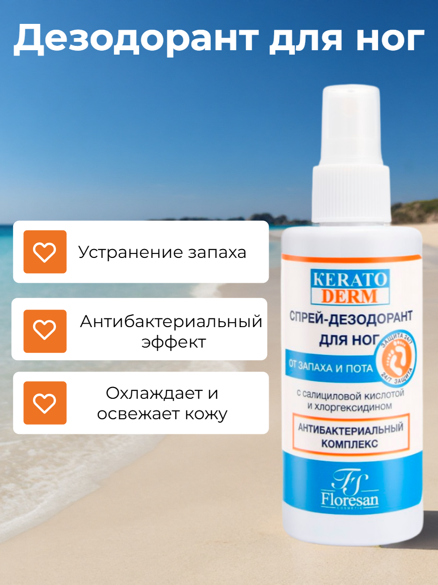 Спрей-дезодорант длительного действия идеально подходит для ежедневного ухода за ногами, особенно при занятиях спортом и активного отдыха. Дезодорирует и ухаживает за кожей стоп при длительном нахождении в закрытой обуви. Обладает выраженным антибактериальным эффектом, препятствует интенсивному потоотделению. Смягчает кожу и дарит длительное ощущение свежести и комфорта.