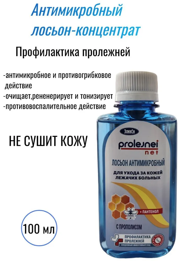 Лосьон-концентрат для ежедневного ухода за кожей лежачих больных, для профилактики пролежней. Разводится с водой в соотношении 1:1 или 1:2. Обладает антимикробным и противогрибковым действием. Очищает, регенерирует и тонизирует кожу. Экстракт прополиса содержит биологически активные вещества и микроэлементы. Обладает антибактериальными и противовоспалительными свойствами.НЕ СУШИТ КОЖУ. Предназначен для профилактики пролежней. Начальная стадия пролежней. Пролежни 1 и 2 начальной стадии. Способ применения:обрабатывать наружно проблемные участки кожи до появления увлажнения кожного покрова. Для профилактики – обрабатывать кожу два-три раза в день.