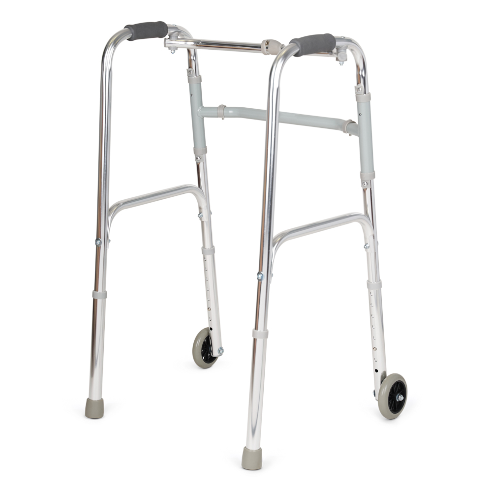 Прочные и удобные ходунки с возможностью регулировки по высоте, маневренными колесами на передних опорных ножках и шагающим режимом Армед KR912L - отличный выбор для пользователей с ослабленными руками. Благодаря наличию колес можно передвигаться методом частичного перекатывания, не поднимая полностью ходунки при ходьбе. Ходули инвалидные после операции, перелома - это безотказная и прочная опора для ослабленных людей. Наличие специальных фиксаторов позволяет изменять режим работы ходунков с фиксированных в шагающие. Для складывания рамы достаточно передвинуть фиксатор на верхней перекладине и собрать две части ходунков. В таком виде их можно положить в любой багажник автомобиля для транспортировки и хранения дома. Модель с конструкцией помогает пожилым людям и людям с ограниченными возможностями подниматься и передвигаться. Складная рама позволяет хранить и хранить ходунки дома. На телескопических ножках есть кнопочный рычаг для увеличения/уменьшения высоты - таким образом их легко можно подстроить под рост пользователя. Прочный захват и отсутствие скольжения при передвижении с ходунками обеспечивают удобные накладки на боковых поручнях. На опорах ходунков предусмотрены резиновые наконечники. Ходунки медицинские для пожилых, взрослых и инвалидов изготовлены из алюминия, поэтому имеют небольшой вес. Ходунки Армед облегчат жизнь инвалидам, помогут в период реабилитации, послужат надежной опорой для спины, так-как модель является ортопедической и анатомической.