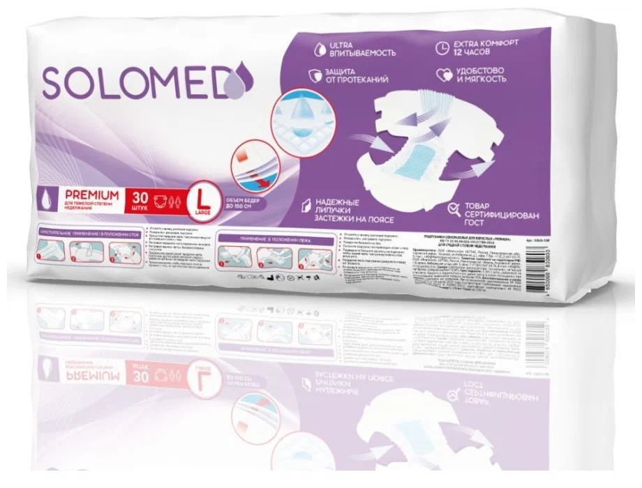 SOLOMED premium – "дышащие" подгузники для защиты при тяжелой степени недержания мочи, предназначены как для активных людей, так и для людей с ограниченными двигательными возможностями. Наружная поверхность подгузника воздухопроницаемая, нескользящая, из тонкого пластичного экологически чистого материала. Двойная система крепления с помощью эластичных резинок в поясе обеспечивает надежное и комфортное использование. Двойной впитывающий слой с суперабсорбентом “Sumitomo” гарантирует высокий уровень впитываемости, а специальная система нейтрализует неприятный запах. Внутренние боковые бортики защищают от протеканий. Отсутствие латексных элементов (Latex Free) снижает риск появления аллергических реакций на латекс. Впитываемость: от 2000 г.